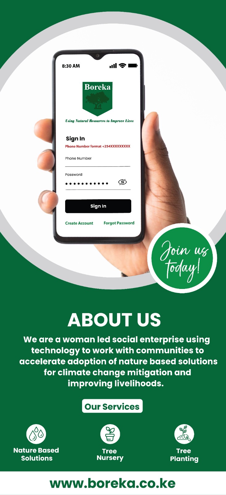 Boreka's main objective is to catalyse and accelerate the implementation of climate action by adopting technological interventions to mobilise, manage and track tree growing activities. Boreka partners with communities to drive and at scale the much needed tree growing activities. Boreka intends to scale to reach millions of small holder farmers and unlock carbon finance opportunities that have emerged in line with changing trends and demands in the climate change and carbon finance space. Boreka partners with major public and private finance institutions including governments and international development organisations to finance the project expansion.